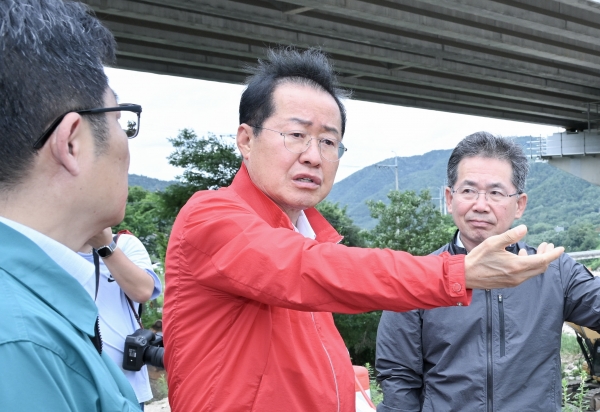 [충청뉴스큐] 홍준표 대구광역시장은 7월 17일 오후, 군위군 부계면 대율리 지방하천 수해 복구현장을 방문했다.