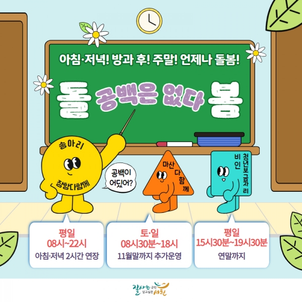 [충청뉴스큐] 서천군은 지난 2월 송아리 돌봄센터를 시작으로 7월부터는 장항 다함께 돌봄센터도 돌봄 시간을 탄력적으로 운영한다.