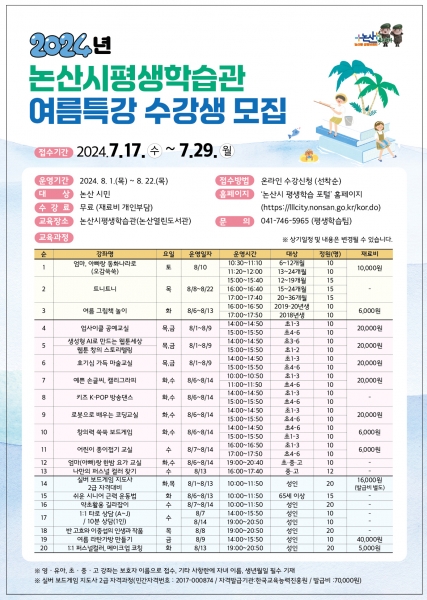 8월 1일부터 8월 22일까지 운영되는 평생학습관 여름 특강은 무료로 진행되며 논산시에 주소를 둔 시민이라면 누구나 논산시 평생학습포털 홈페이지에서 온라인 접수하면 된다.
