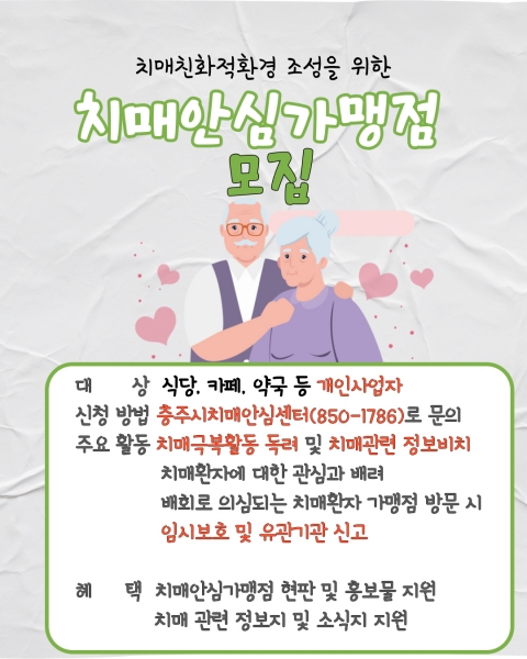 [충청뉴스큐] 충주시 치매안심센터가 지역사회의 촘촘한 치매 안전망 구축을 위해 ‘치매 안심 가맹점’을 모집한다.