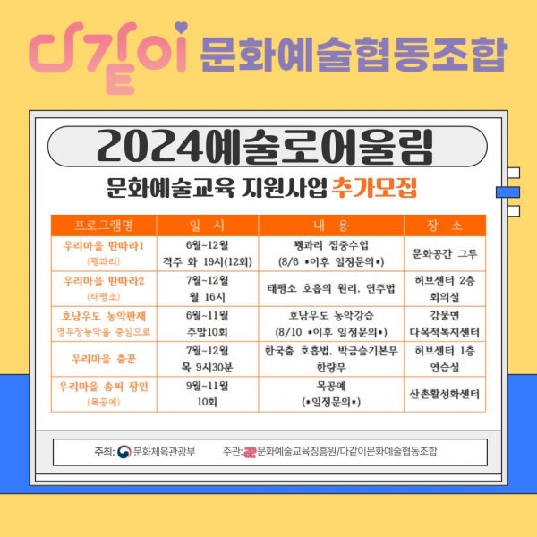 한편 2024 예술로어울림 사업은 전국 60개 기초지역에서 동시에 진행되며 다같이 문화예술협동조합은 인구소멸 지역 괴산에서 사업을 추진하게 됐다.