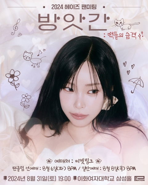 소속사 피네이션에 따르면 헤이즈는 오는 8월 31일 오후 7시 이화여자대학교 삼성홀에서 단독 팬미팅 ‘2024 헤이즈 팬미팅 [방앗간 : 떡들의 습격]’을 열고 팬들과 만난다.