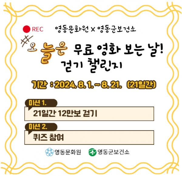 [충청뉴스큐] 충북 영동군 보건소는 8월 1일부터 21일까지 영동문화원과 함께 ‘오늘은 무료 영화 보는 날 걷기 챌린지’를 진행한다고 밝혔다.