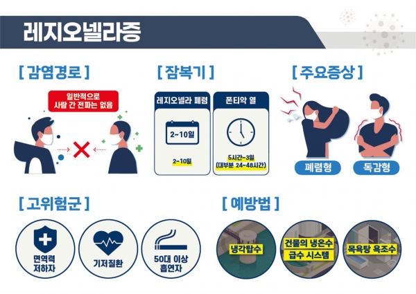 레지오넬라증은 제3급 법정 감염병으로 냉각탑수, 건물의 급수시설, 욕조수, 분수 등에 존재하는 레지오넬라균이 호흡기로 흡입되어 감염을 일으키며 주로 여름철 온도와 습도가 높아질 때 발생의 위험이 증가한다.