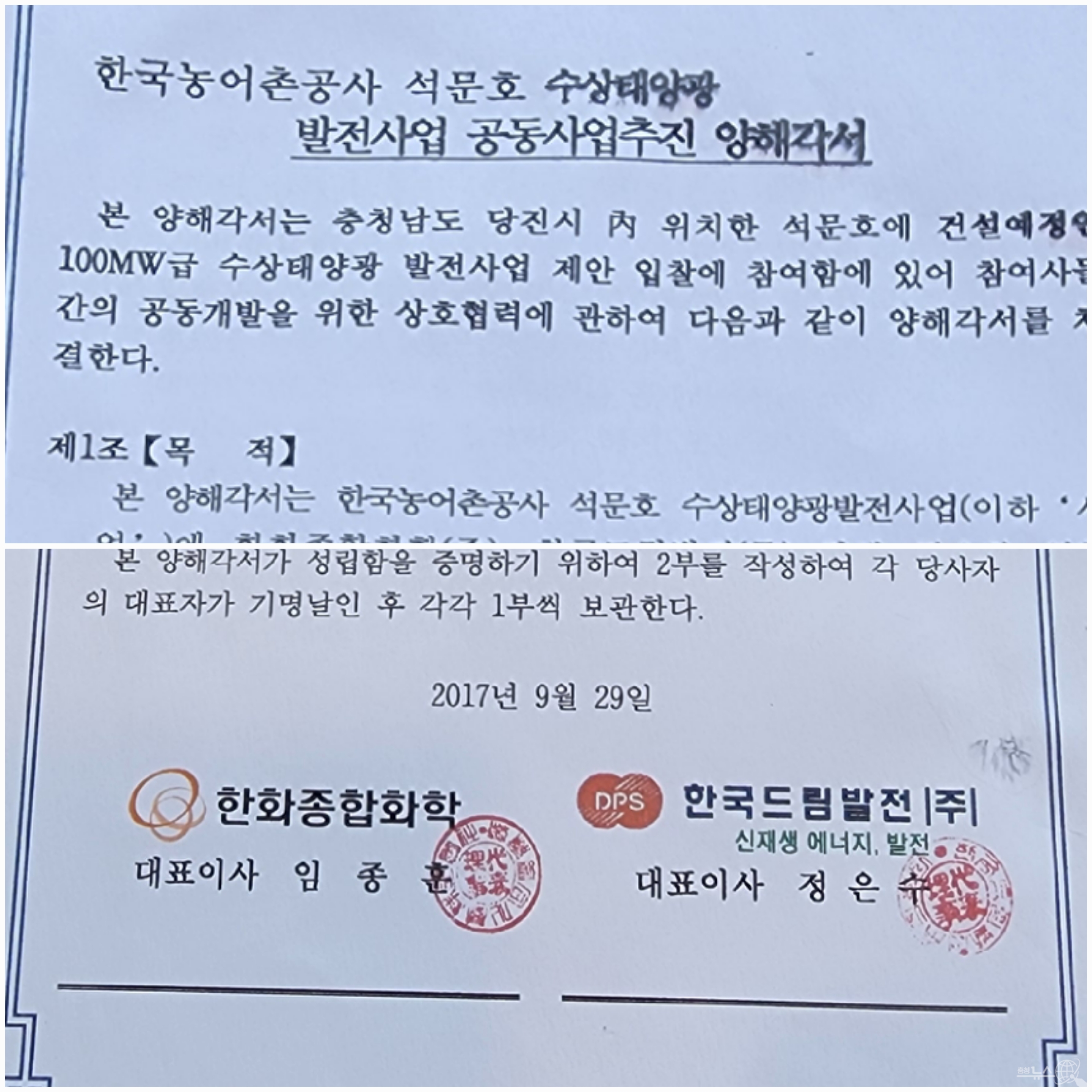 2017년 9월 한화종합화학과 드림발전㈜이 공동사업 추진을 위한 양해각서(MOU) 사진/드림발전㈜ 제공