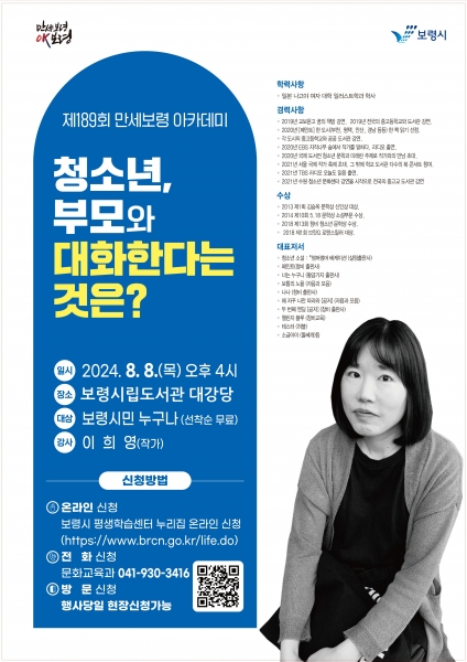 [충청뉴스큐] 보령시는 오는 8일 오후 4시 보령시립도서관 대강당에서 이희영 작가를 초청해 ‘청소년, 부모와 대화한다는 것은?’이라는 주제로 제189회 만세보령 아카데미를 개최한다.