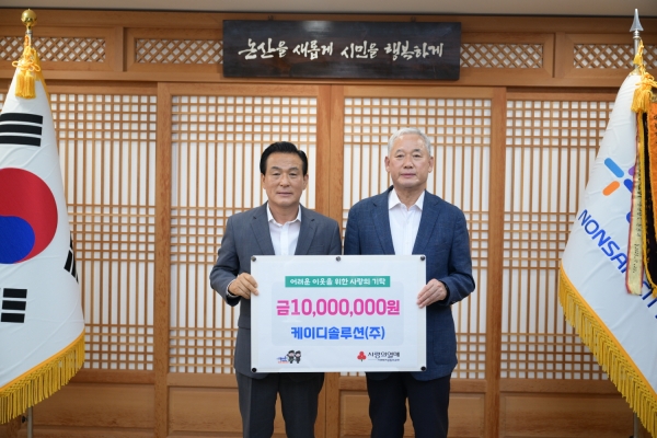 [충청뉴스큐] 논산시는 케이디솔루션에서 7일 논산시청을 방문해 1천만원을 기탁했다고 전했다.