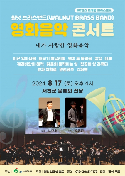 [충청뉴스큐] 서천군은 오는 17일 오후 4시에 문예의전당 대강당에서 50인조 브라스밴드가 연주하는 ‘내가 사랑한 영화음악’콘서트를 개최한다.