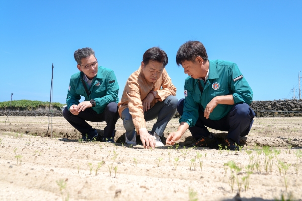 오영훈 제주도지사는 12일 오전 구좌읍 당근 농지 가뭄현장을 방문해 상황을 점검하고 즉각적인 지원방안을 모색했다.