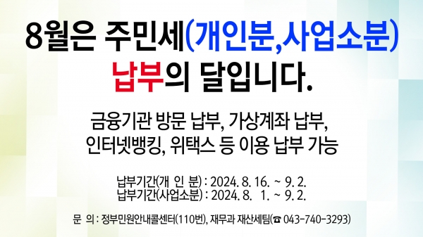 주민세 개인분의 경우 7월 1일 현재 영동군에 주소를 둔 세대주에게 부과되고 사업소분의 경우 7월 1일 현재 사업소를 둔 개인 및 법인 사업주가 9월 2일까지 신고·납부하면 된다.