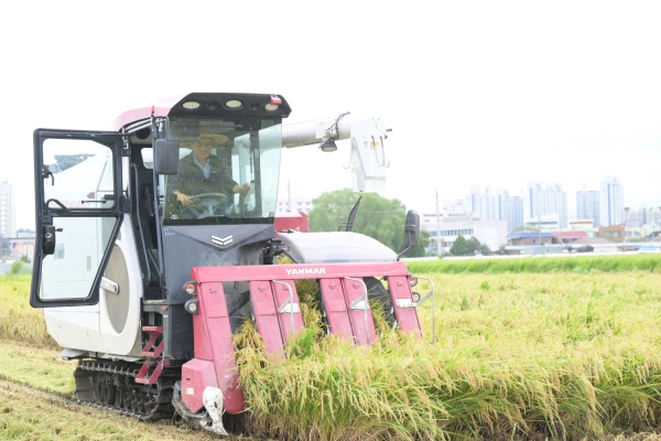 백성현 논산시장은 이 날 현장을 방문해 직접 콤바인을 운전하며 벼 베기 시연을 진행했다.
