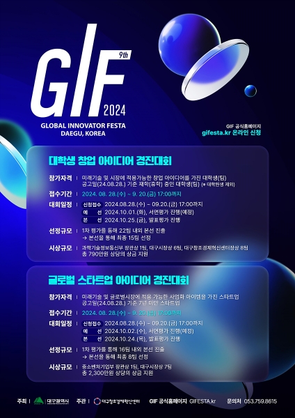 올해 9회째를 맞는 ‘2024 글로벌 이노베이터 페스타’는 미래 신산업을 이끌 창의 인재를 양성하고 혁신적인 창업 아이디어를 발굴하기 위해 추진해 온 대구의 대표적인 글로벌 창업 행사로 이번 행사는 2024 미래혁신기술박람회에 맞춰 10월 23일부터 10월 26일까지 엑스코에서 개최한다.