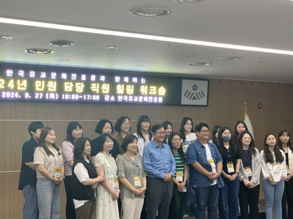 한국유교문화진흥원에서 진행된 이번‘힐링워크숍’은 민원 업무 수행 공무원들의 감정노동 스트레스 해소 및 재충전의 시간을 제공하기 위해 마련됐으며 △유교문화 속 공직가치 찾기 △기획전시 관람 △한글캘리그라피 체험 및 다도체험 △퓨전국악 공연 관람 △시장과 함께하는 소통 간담회 등 다양한 프로그램으로 진행됐다.