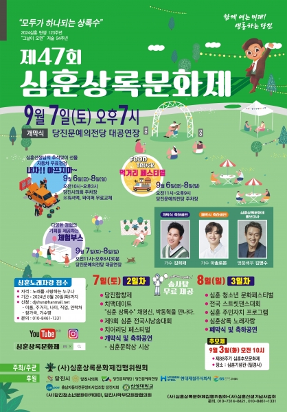 올해는 2024년 낭만콘서트 5080을 시작으로 당진합창제, 치맥데이트, 심훈 전국시낭송대회, 전국 스트릿댄스대회, 심훈상록 노래자랑 등 다채로운 프로그램과 26개의 체험·홍보부스가 펼쳐진다.