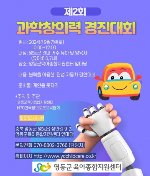 [충청뉴스큐] 충북 영동군 육아지원 거점기관인 영동군육아종합지원센터에서 미취학 아동 대상으로 오는 7일 센터 앞마당에서 ‘제2회 과학창의력 경진대회’를 개최한다.