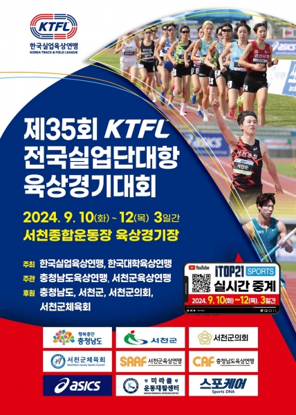 [충청뉴스큐] 서천군은 이달 10일부터 12일까지 3일간 서천종합운동장에서 ‘제35회 서천KTFL 전국실업단대항육상경기대회 및 제78회 전국대학대항육상경기대회’를 개최한다.