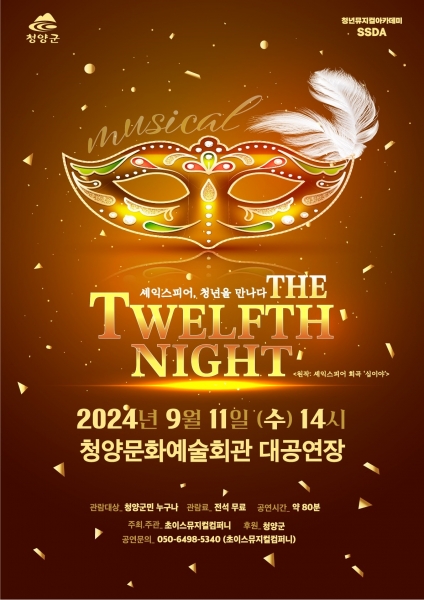 김용구 문화체육과장은 “영원한 고전문학 셰익스피어의 희곡 ‘십이야’ 가 새롭게 해석되고 청양 관내 청년 및 청소년들의 참여한 이번 공연에 대한 기대가 크다 뮤지컬은 청양군에서 특히 마음을 먹고 관람할 수 있는 귀한 문화 예술 양식이라고 생각한다 청양군이 후원하고 초이스뮤지컬컴퍼니와 관내 청소년·청년 문화예술인이 만든 뜻깊은 이번 공연에 많은 군민들이 관람해 예술적 표현의 아름다움과 작품 속 인물의 삶을 통해 일상에 새로운 의미를 느끼는 즐거운 시간이 되길 바란다”고 전했다.
