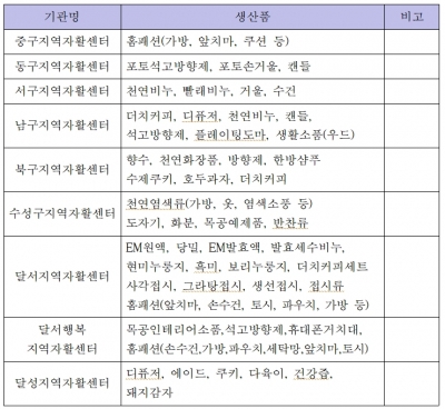 대구자활別別순회장터에서는 가방, 앞치마, 쿠션 등 생활소품과 호두과자, 수제쿠키, 현미누룽지 등 식품류와 천연비누, 천연화장품, 한방샴푸, 도자기류 등 다양한 생산품을 판매한다.