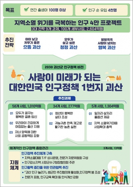 군이 발표한 이번 추진전략은 ‘사람이 미래가 되는 대한민국 인구정책 1번지 괴산’ 이라는 비전 아래, 오는 2030년까지 △연간 출생아수 100명 이상 회복 △인구 순유입 4천 명 달성 목표를 설정했다.
