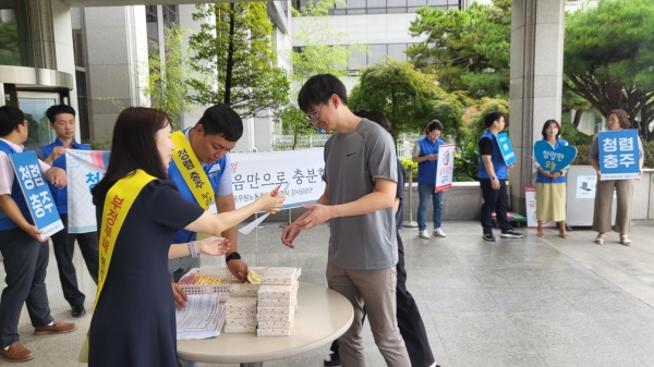 이날 캠페인에 참여한 조길형 충주시장은 “추석 명절을 앞두고 선물 안주고 안받기 운동을 실천하는 등 청렴 문화 확산을 위해 전 직원이 노력해 달라”고 말했다.