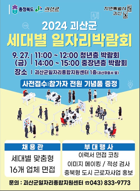 [충청뉴스큐] 충북 괴산군은 오는 27일 괴산허브센터에서 세대별 일자리 박람회를 개최한다.