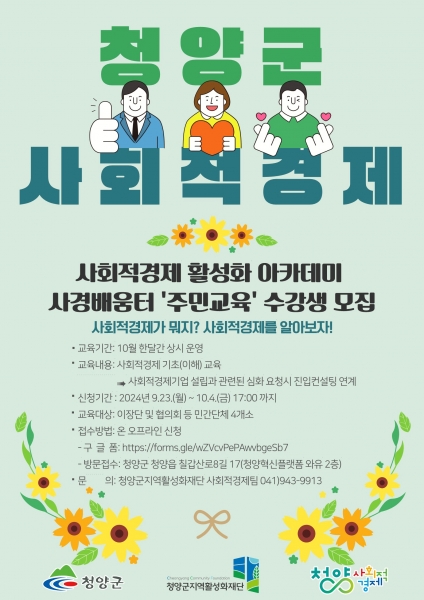 [충청뉴스큐] 청양군은 이장단 등 민간 단체를 대상으로 사회적경제 활성화 아카데미‘사경배움터’의 “주민 교육” 수강생을 오는 10월 4일까지 모집한다고 밝혔다.