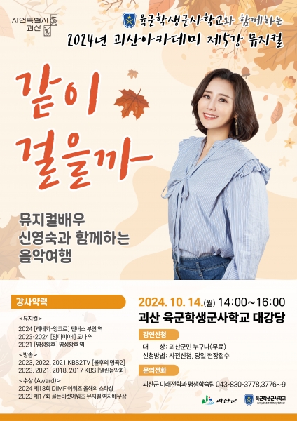 이번 강연은 괴산군과 육군학생군사학교가 협력해 진행하며 뮤지컬 배우 신영숙을 초청해 ‘신영숙과 함께하는 음악여행, 같이 걸을까’라는 주제로 진행된다.