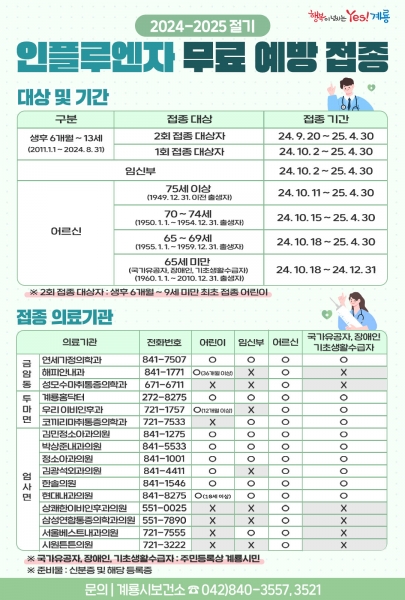[충청뉴스큐] 계룡시는 내년 4월 30일까지 겨울철 호흡기 감염병 유행에 대비해 인플루엔자 무료 예방접종을 실시한다고 밝혔다.