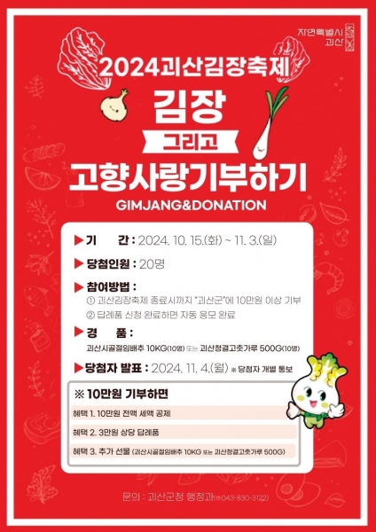 송인헌 괴산군수는 “2024 괴산김장축제와 함께하는 고향사랑기부제 이벤트에 많은 관심과 참여를 부탁드린다”며 “이번 기부제를 통해 주민복지 증진과 함께 지역사회와 마음을 나누는 계기가 되었으면 한다”고 전했다.