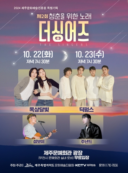 [충청뉴스큐] 제주문화예술진흥원이 KCTV제주방송과 공동 기획으로 제주문예회관 광장에서 ‘제2회 더 싱어즈 ‘The Singers’’ 야외음악회를 개최한다.
