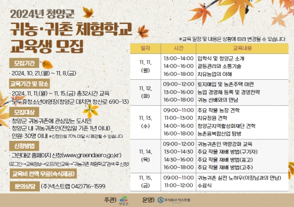 [충청뉴스큐] 청양군은 귀농·귀촌인의 안정적인 정착을 지원하기 위해 다양한 교육 과정을 추진하고 있는 가운데, 1년 이내 신규 및 예비 귀농·귀촌인의 안정적인 청양군 정착을 위한 ‘2024년 청양군 귀농귀촌 체험학교’ 교육생을 오는 11월 8일까지 모집한다.
