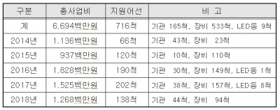 ‘친환경 에너지절감장비 보급사업’’은 친환경 에너지 절감형 LED등, 유류비 절감을 위한 유류절감장치, 저효율 기관 및 사용연수가 많은 노후기관의 대체, 어선의 안전·복지 등을 위한 장비 설치 등을 지원하는 사업으로, 주요 지원대상은 LED 집어등과 작업등, 유류절감장치, 해상용 디젤기관 및 선외기 엔진, GPS플로터, 레이다, 통신장비, 양승기, 양망기 등이 해당된다.