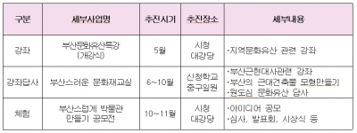 이 사업은 문화재청이 지역에 특화된 문화유산 교육을 발굴·운영하기 위해 추진하는 ‘2019 지역문화유산교육 공모사업’에 부산시가 선정되어 추진하는 것이다.