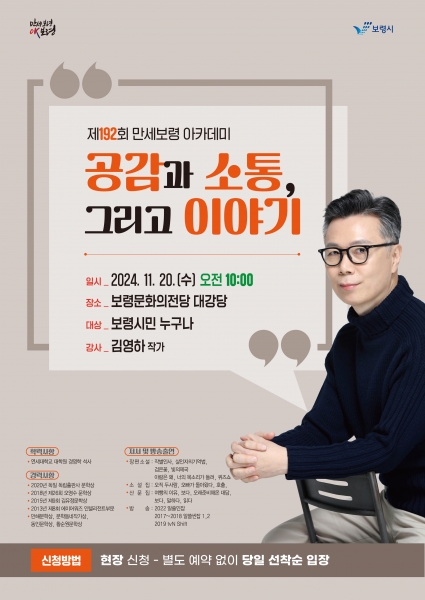 [충청뉴스큐] 보령시는 오는 20일 오전 10시 보령문화의전당 대강당에서 작가 김영하를 초청해 ‘공감과 소통, 그리고 이야기’라는 주제로 제192회 만세보령 아카데미를 개최한다.