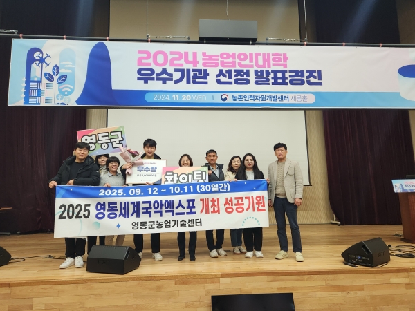 [충청뉴스큐] 충북 영동군 농업기술센터는 농촌진흥청이 주관하는 ‘2024년도 농업인대학 우수기관 선정 발표 경진대회’에서 ‘우수상’을 수상했다고 25일 밝혔다.