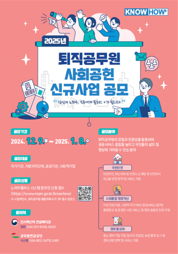 인사혁신처는 ‘2025년 퇴직공무원 사회공헌 사업’ 신규사업을 내년도 1월 8일까지 공모한다고 밝혔다.