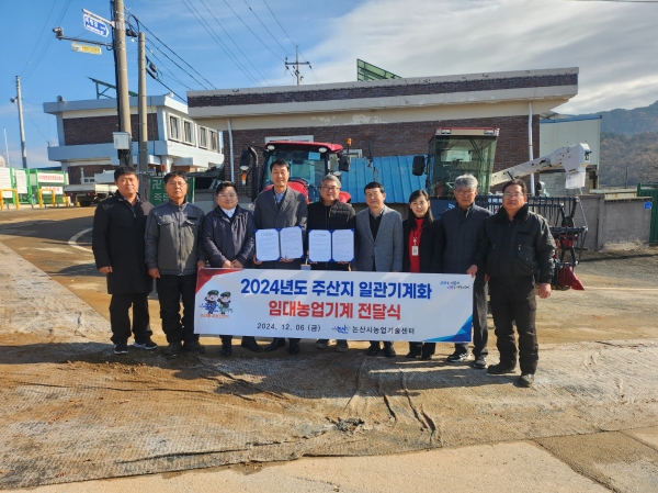[충청뉴스큐] 논산시는 지난 6일 농림축산식품부 지원 사업의 일환으로 시행하는 ‘2024 주산지 일관 기계화 지원 사업’의 대상자로 선정된 연무읍 소재 봉황작목반에서 전달식을 진행했다.