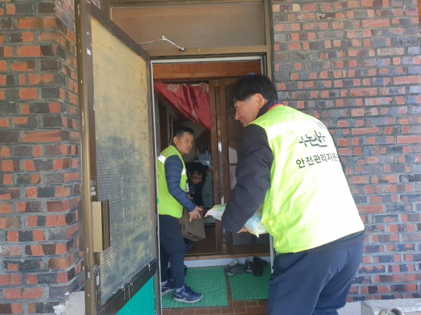 [충청뉴스큐] 논산시 안전관리자문단은 12월 안전점검의 날을 맞이해 관내 재난 취약 가구 21가구에 대해 동절기 재난취약시설 안전점검을 실시하고 쌀 22말, 라면 22박스, 문어발 콘센트 및 전구 등을 구매해 가구당 각 1개씩을 전달 및 교체하며 위로와 격려를 전했다.