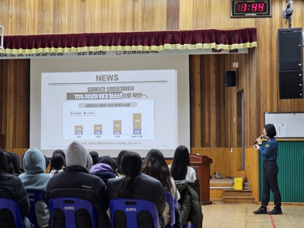 이번 교육은 논산경찰서 여성청소년과, 대전해바라기센터와 함께 진행됐으며 딥페이크 성범죄의 실태를 알려 이에 대응하고 예방하기 위한 취지로 마련됐다.