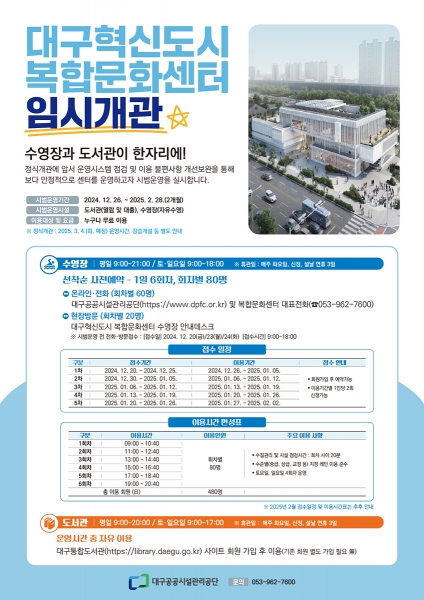 [충청뉴스큐] 대구광역시는 대구혁신도시 복합문화센터의 부실시공 하자보수공사를 지난 11월 완료하고 시민들이 여가와 문화를 함께 누릴 수 있는 복합문화센터를 12월 26일 임시 개관한다.