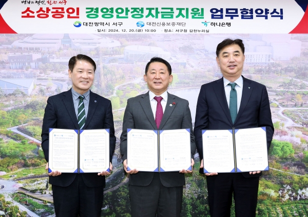 [충청뉴스큐] 대전 서구는 20일 구청 갑천누리실에서 대전신용보증재단, 하나은행과 함께 ‘서구 소상공인 경영안정자금 지원사업’의 확대를 위한 3자 업무협약을 체결했다.