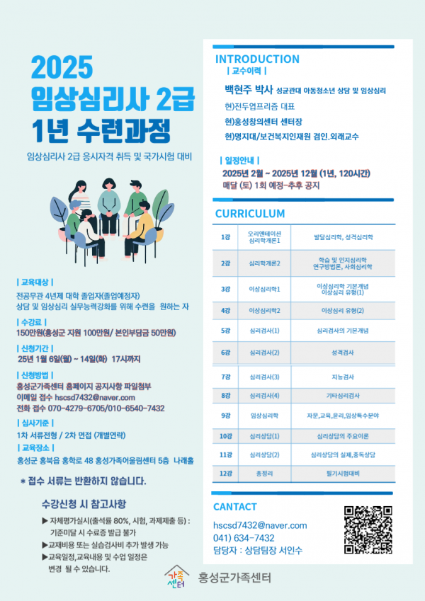 교육과정은 2025년 2월부터 2025년 12월까지 총 12회기로 매월 셋째주 토요일에 운영할 예정이며 교육 수료자는 임상심리사 2급 취득 응시자격인 수료증을 받게 된다.
