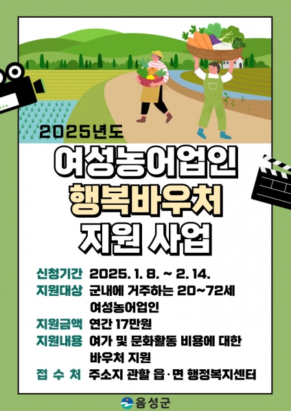 [충청뉴스큐] 음성군은 2025년 여성농업인 행복바우처를 대상자 관할 주소지 읍면 행정복지센터에서 8일부터 2월 14일까지 신청을 받는다고 밝혔다.