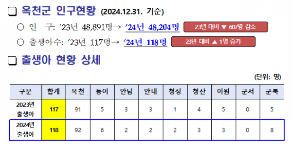 특히 옥천읍, 동이면, 청성면, 군북면에서는 2023년보다 많은 아기가 태어나 침체됐던 옥천군 인구 유입에 활력을 불어넣어 줬다.