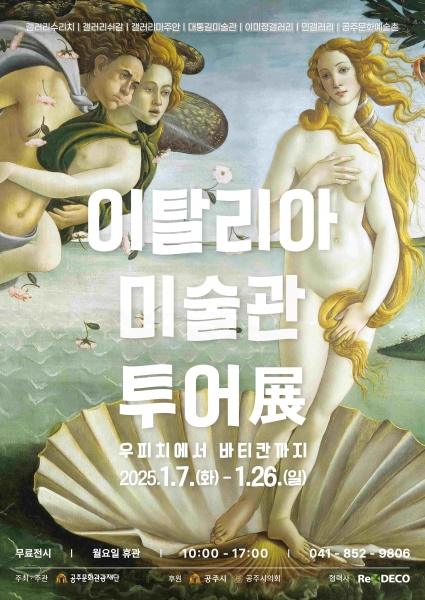 [충청뉴스큐] 공주문화관광재단이 관내 전시공간 운영 역량을 갖춘 민간 갤러리 6곳과 협업해 ‘2025 공유전시 ‐ 이탈리아 미술관 투어 展 : 우피치에서 바티칸까지’ 레플리카 전시를 1월 7일부터 26일까지 개최한다.