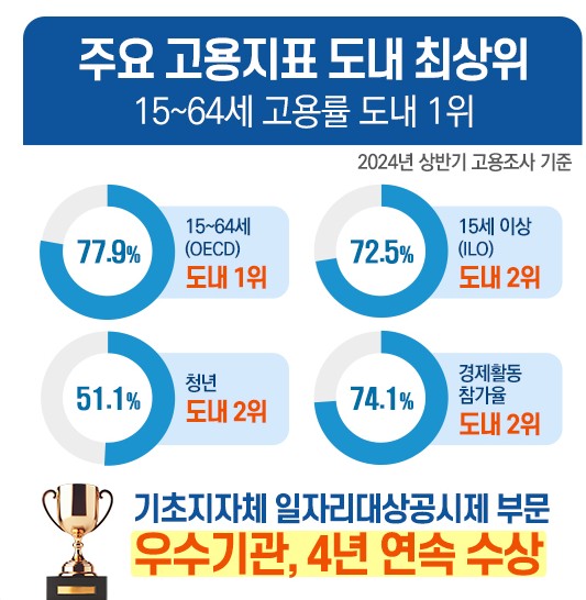 이처럼 지속적인 기업 유치와 고용 환경이 개선된 결과 OECD 기준 15~64세 고용률 77.9%로 충북 1위, 지역활동인구 지표에서 11만 8천명으로 전국 군 지자체 1위의 성적을 얻었다.