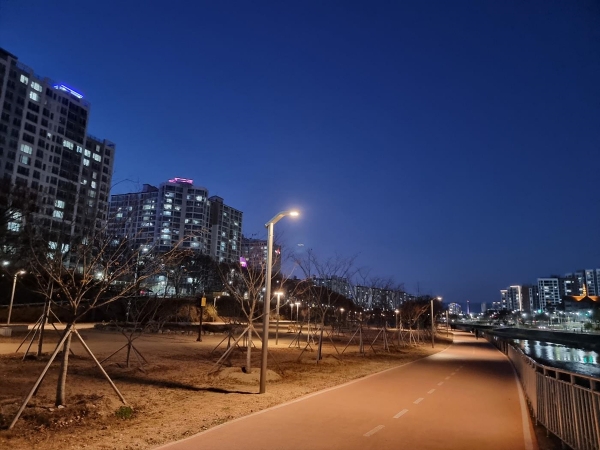 기존 가로등이 50~60m 간격)으로 어두웠지만 30~40m 간격으로 추가 설치해 도심공원 조도기준에 맞춰 평균 20럭스의 밝기로 자전거도로와 산책로 전 구간에 고르게 조명을 배치했다.