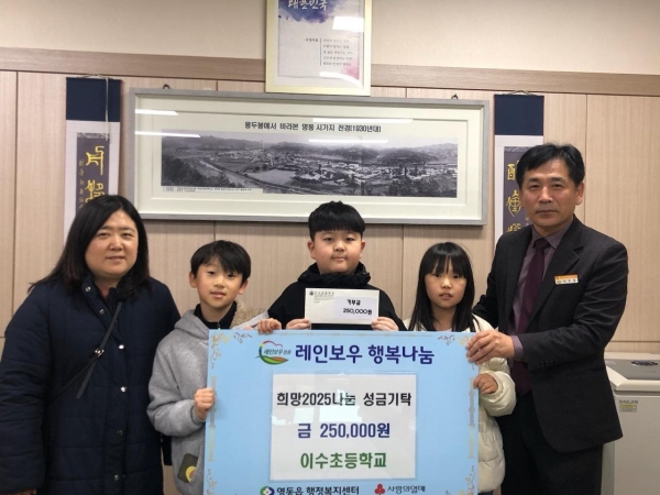 서우종 영동읍장은 “이웃 사랑을 몸소 실천하고 소중한 성금을 기탁해 주신 학생들과 학교 측에 깊이 감사드린다”며 “영동읍도 복지 사각지대에 놓인 이웃들을 위해 지속적으로 관심을 기울이고 지원에 최선을 다하겠다”고 말했다.