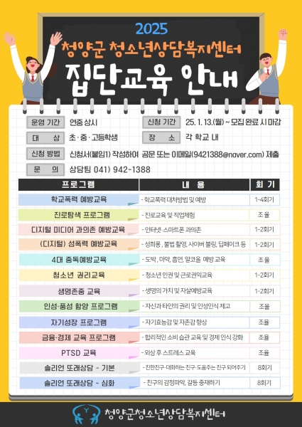 [충청뉴스큐] 청양군청소년재단 청소년상담복지센터에서는 13일부터 청소년을 대상으로 찾아가는 ‘2025년 청소년 집단프로그램’ 참여기관을 모집 중이라고 밝혔다.