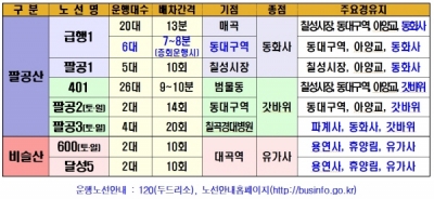 [충청뉴스큐] 대구시는 오는 12일 석가탄신일을 맞아 팔공산, 비슬산 등지의 사찰을 방문하는 참배객이 증가 할 것으로 예상됨에 따라 이용객이 많은 급행1번 노선을 증차하는 등 특별 버스운행 대책을 마련했다고 밝혔다.